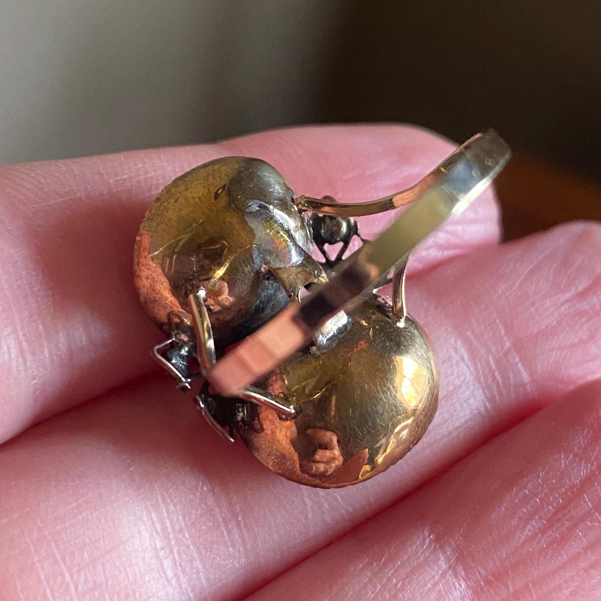 Little openwork leaves glittering with pyrite studs flank its either side; leading into a later-added gold, bifurcated shank for its now contemporary use as a finger ring.