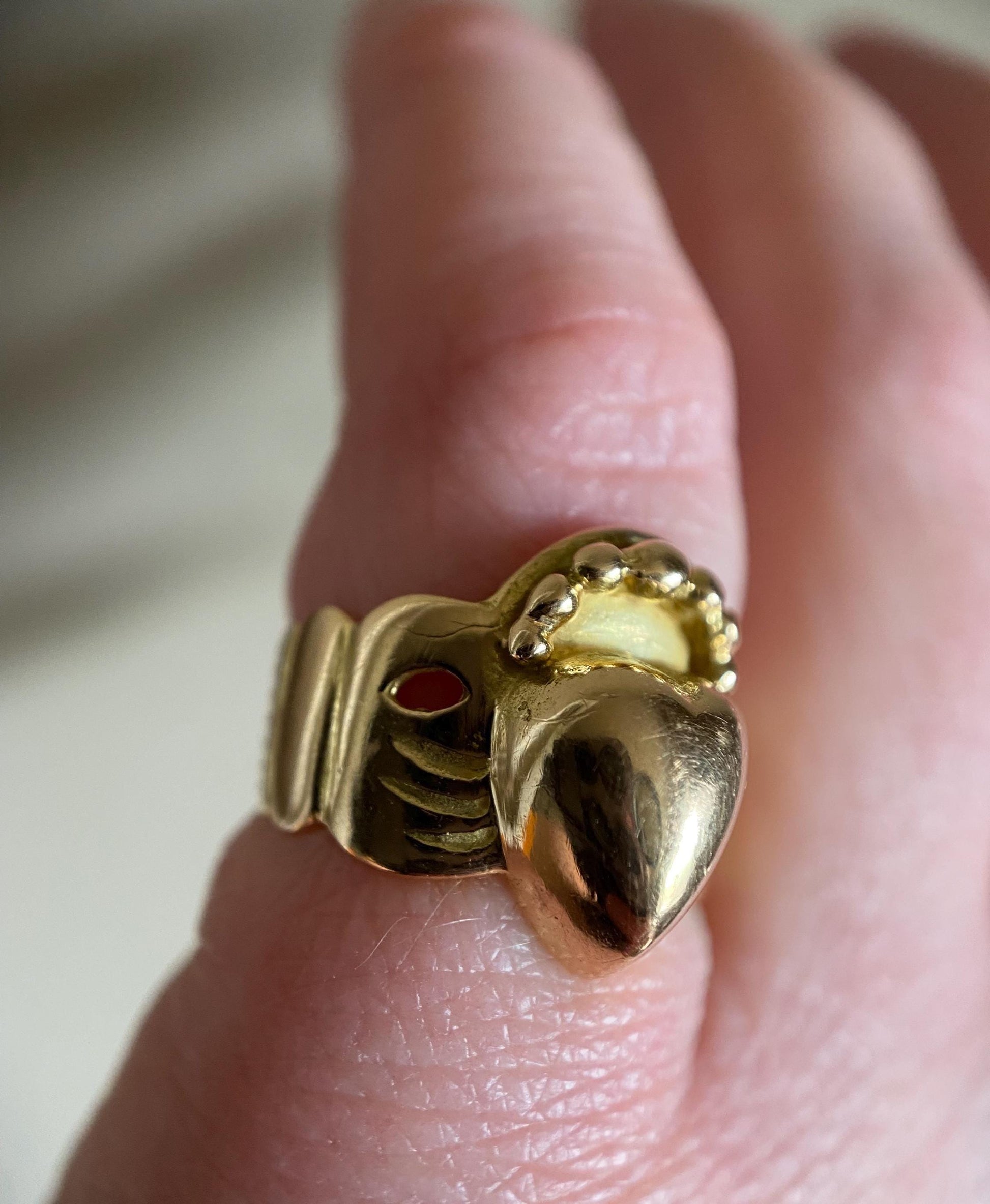 Fully constructed of 18k gold and originally crafted as an engagement ring, this piece has been modeled in the ancient, archetypal "fede" symbol of union of two hands clasping: In this iteration, a flat, two dimensional pair of hands, with scored ruffs at the wrists, hold a deeply puffed heart; surmounted by a halo of raised, round dots representative of a crown. Love's union reigns supreme.
