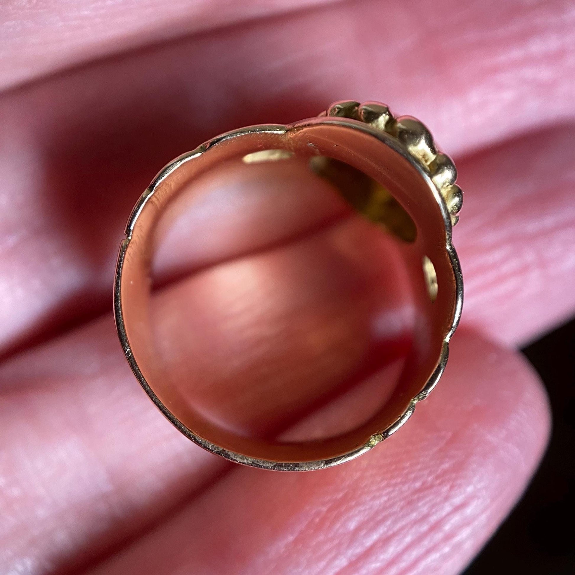In immaculate antique condition. The heart and crown bezel measures 14.55mm by 9mm. It is a size 5, fitting slightly snugger thanks to the thick, wide shank. The ring weighs a considerable 5.5 grams.
