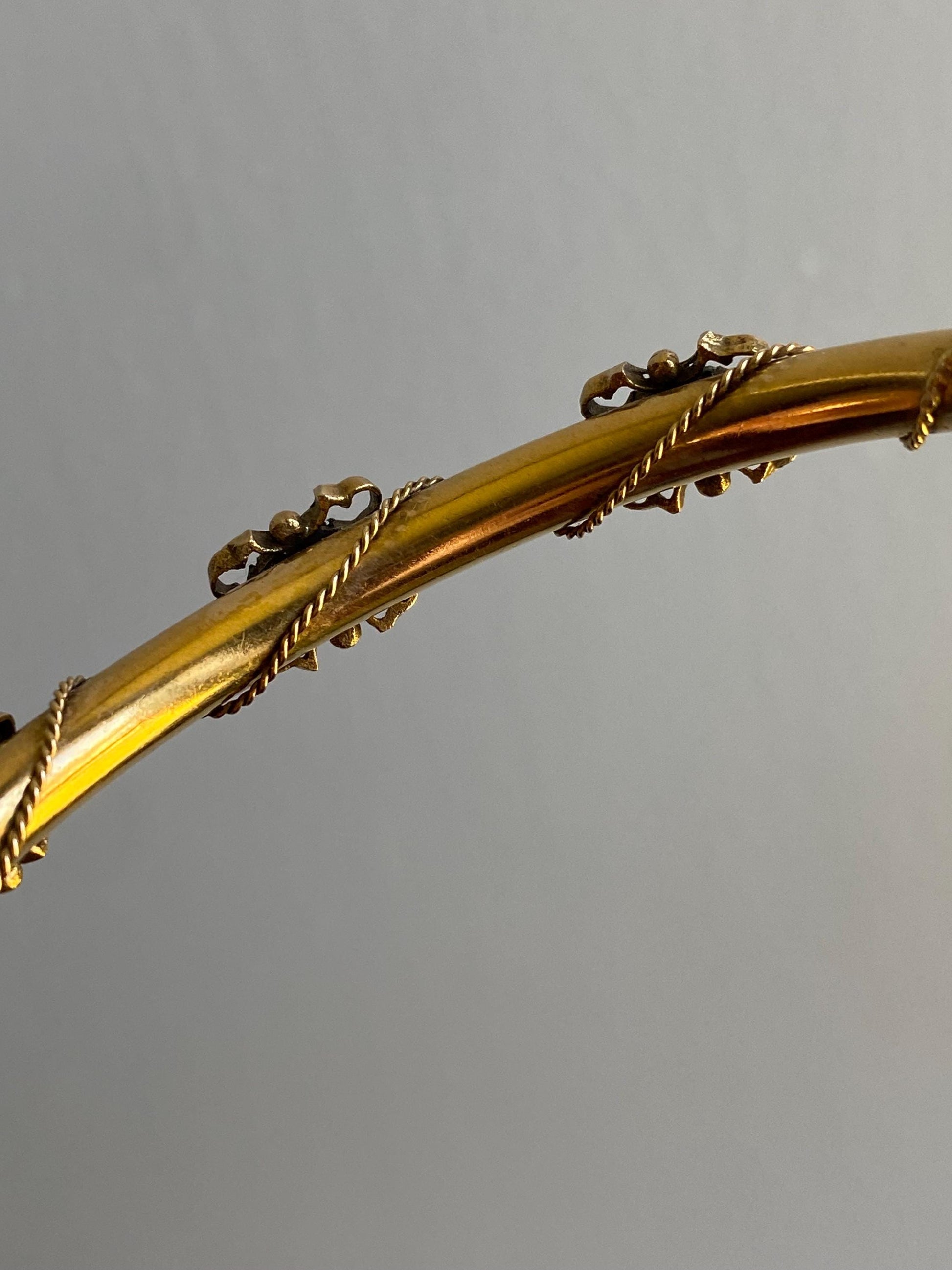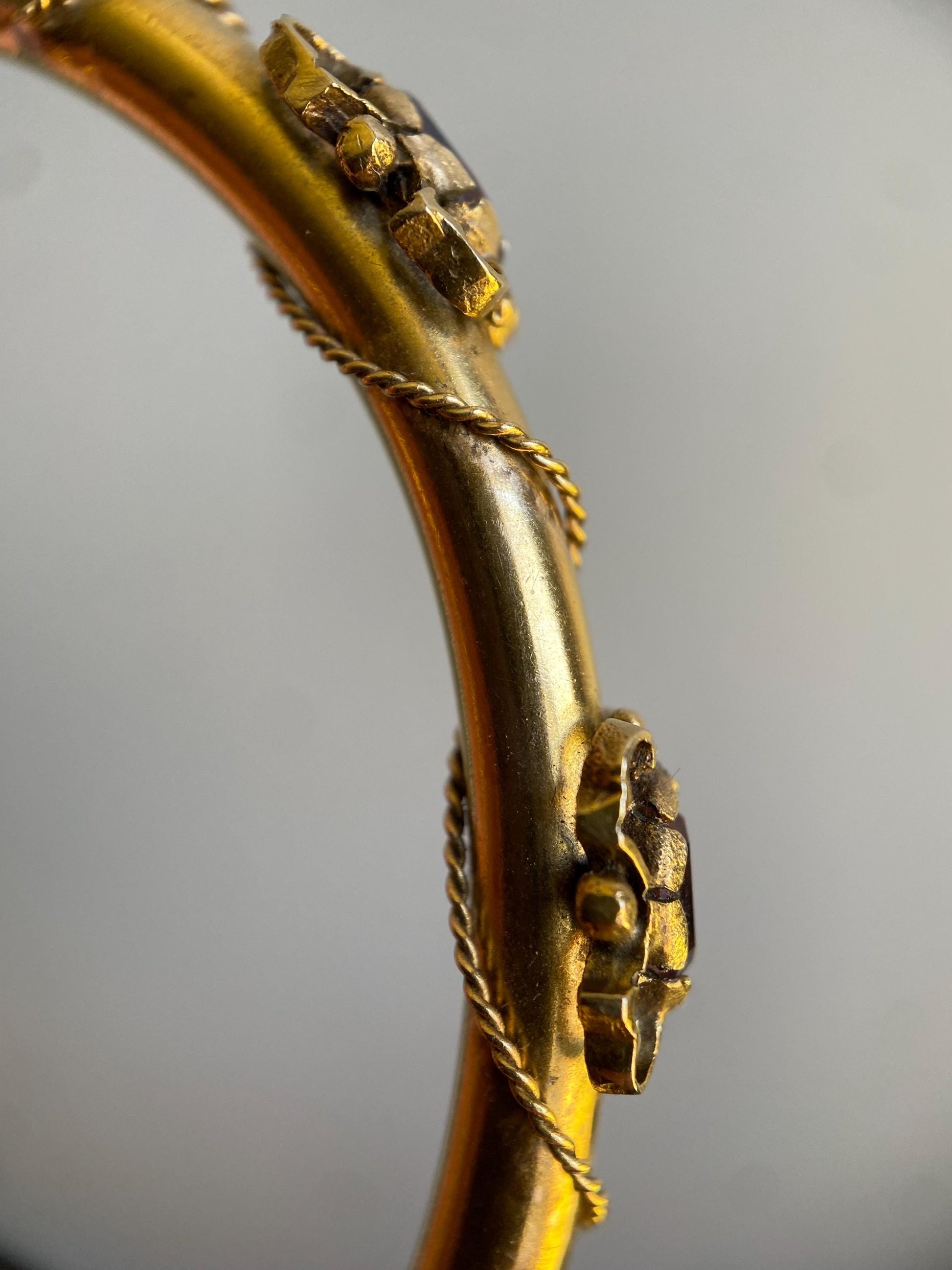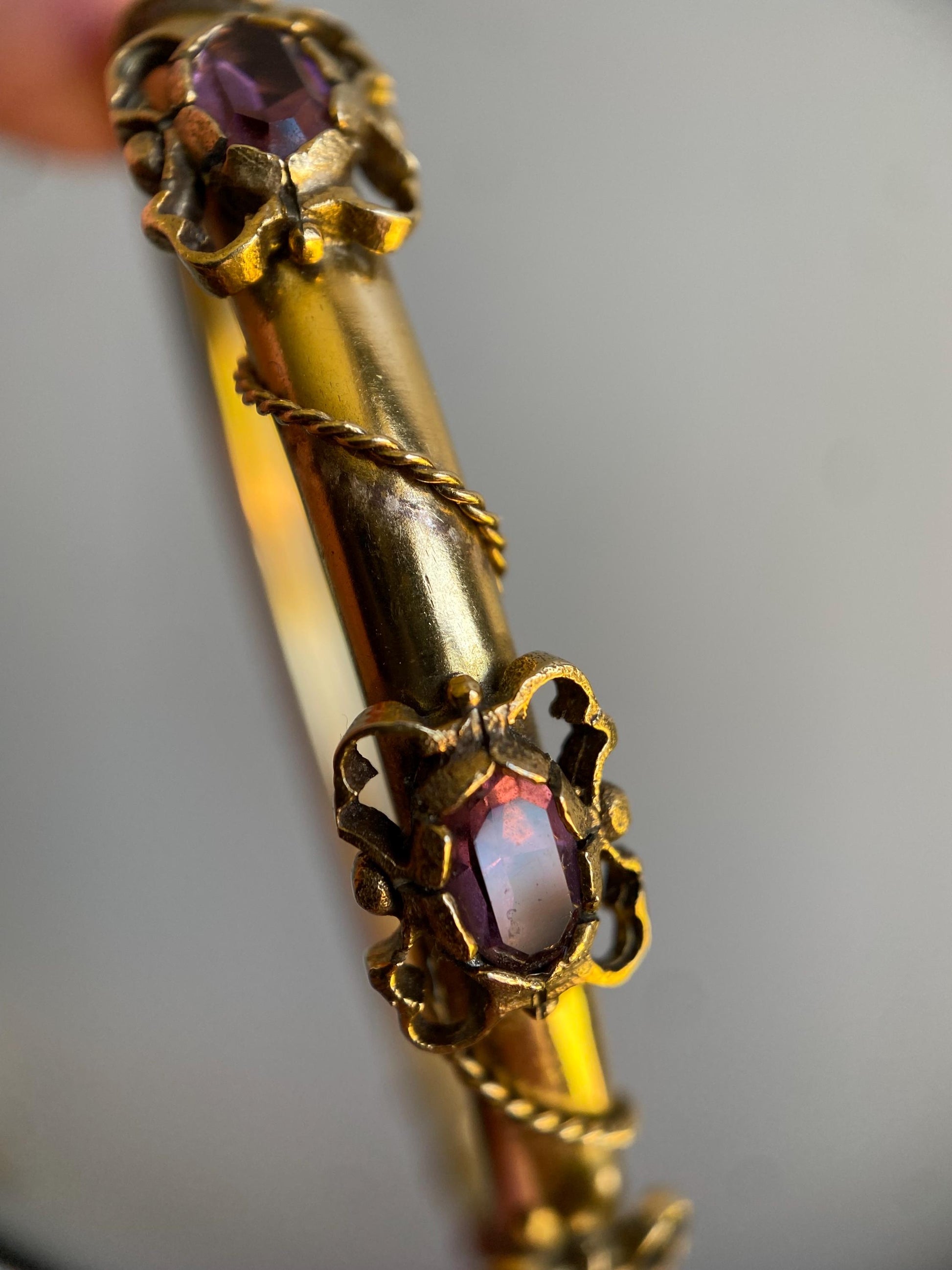 Vintage Amethyst Hinged Hollow Tube Bangle w/ Twisted Rope Accents in 14k Gold, Bracelet, Gem, Victorian, Bypass, 1900s, Etruscan, Edwardian