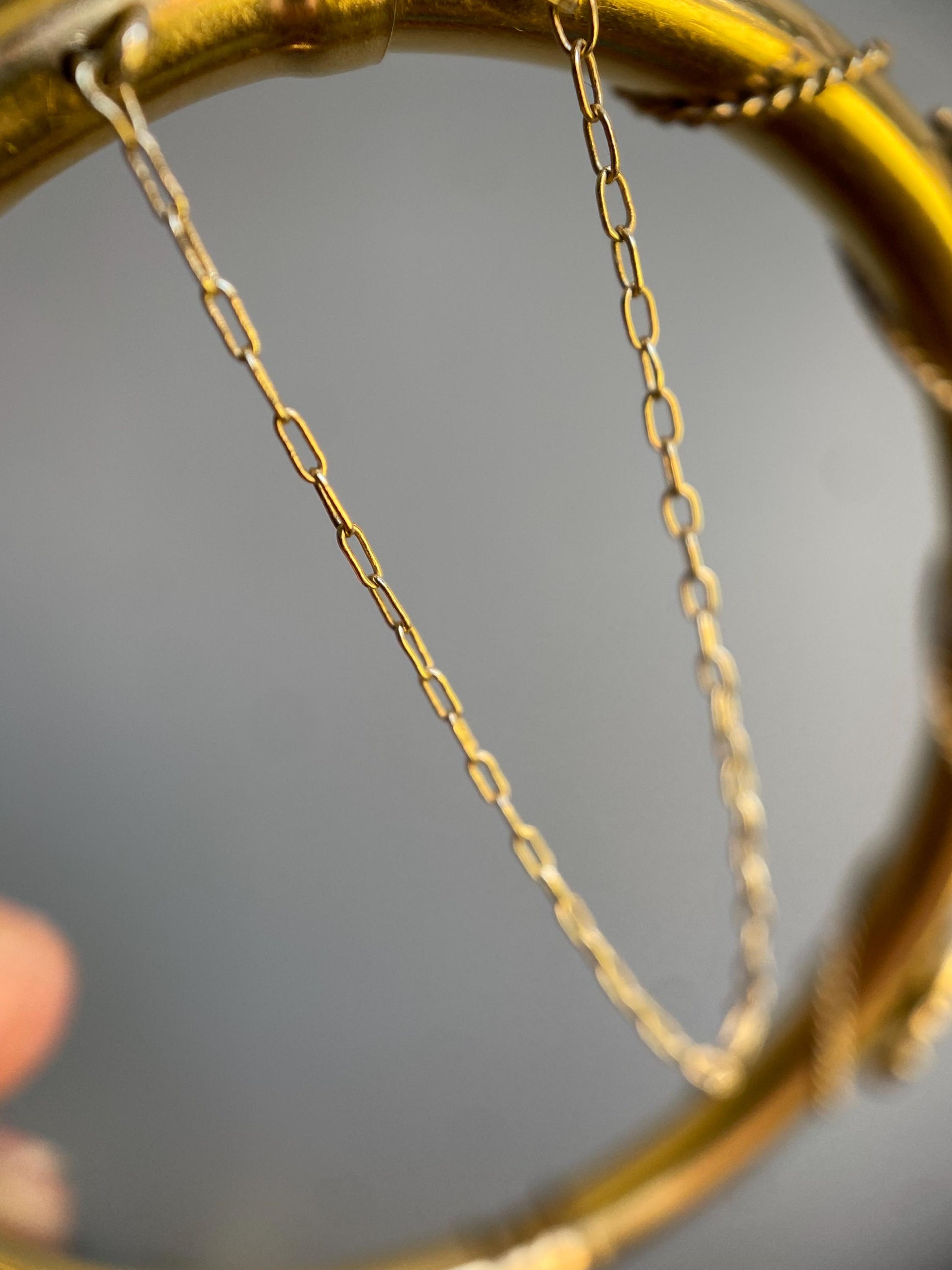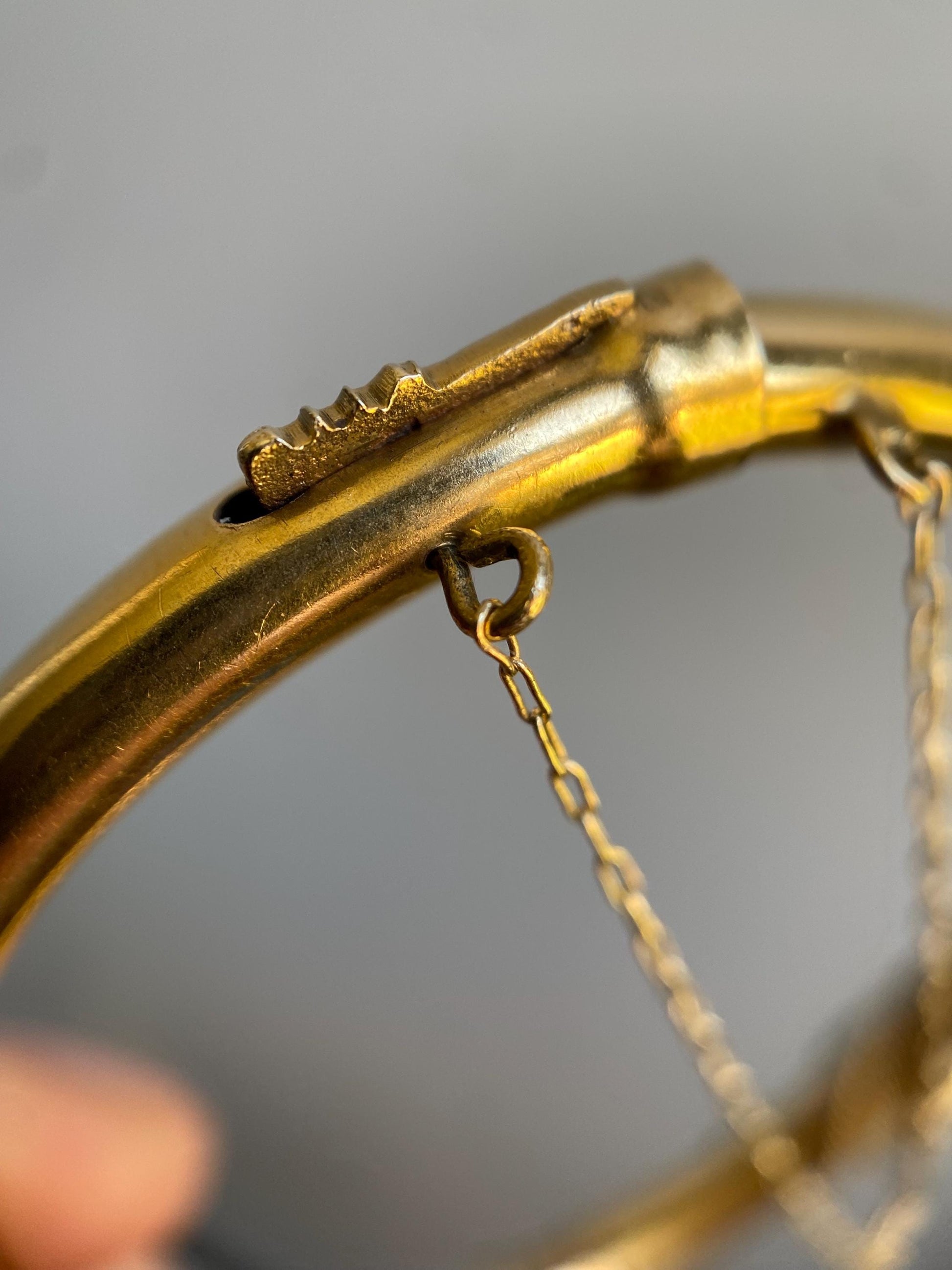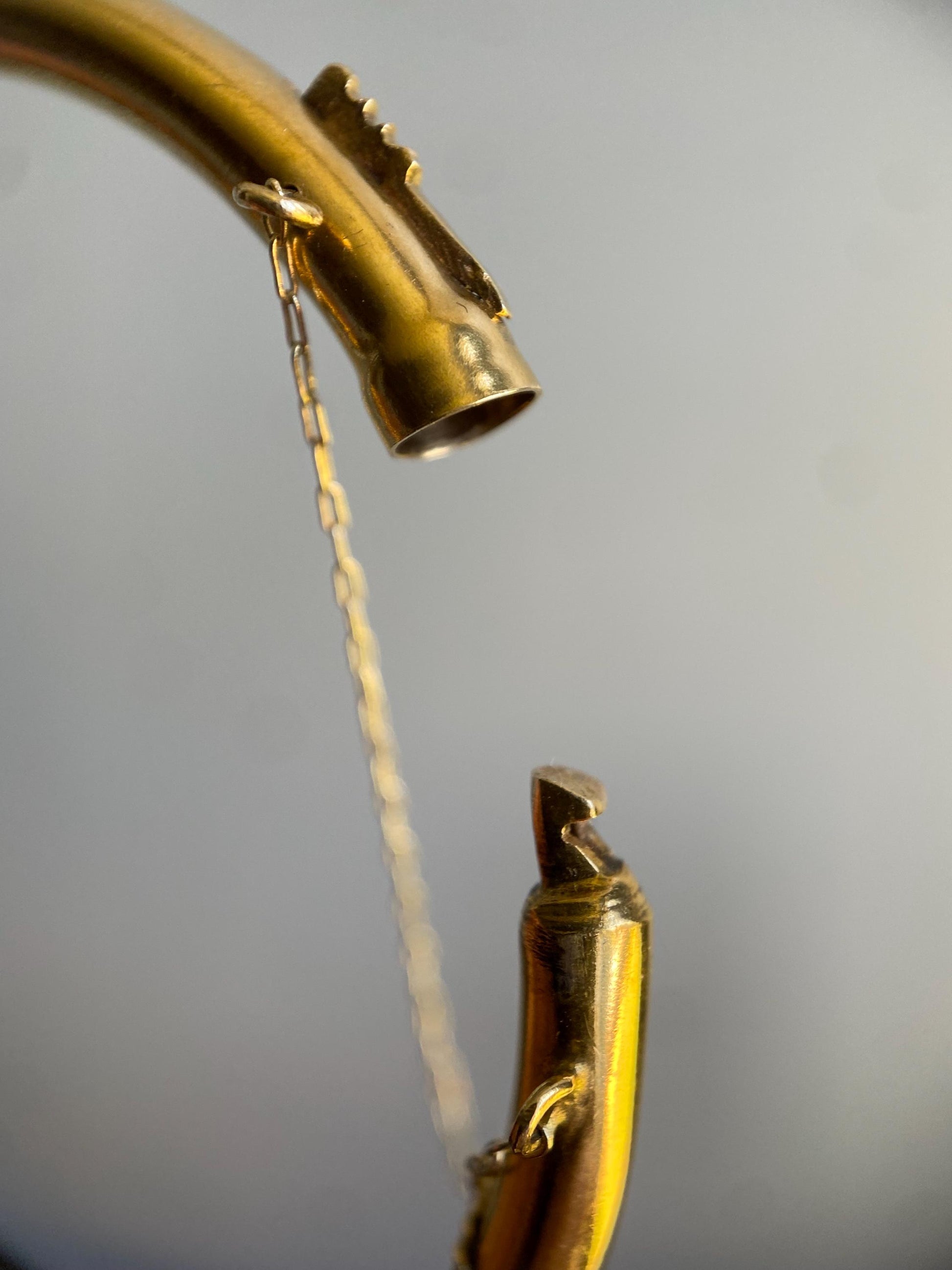 A hidden, ridged push clasp and a tiny linked safety chain finish off the details of this oval, hinged 14k yellow gold bracelet.