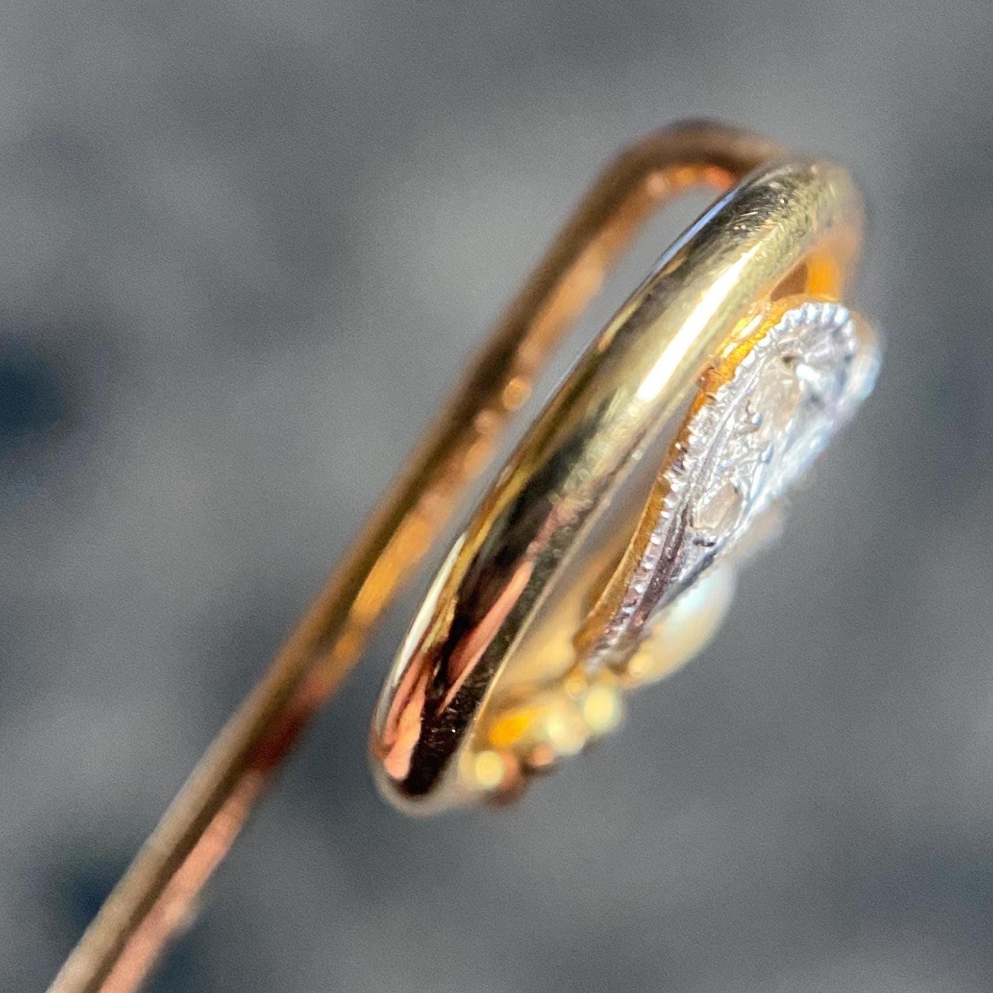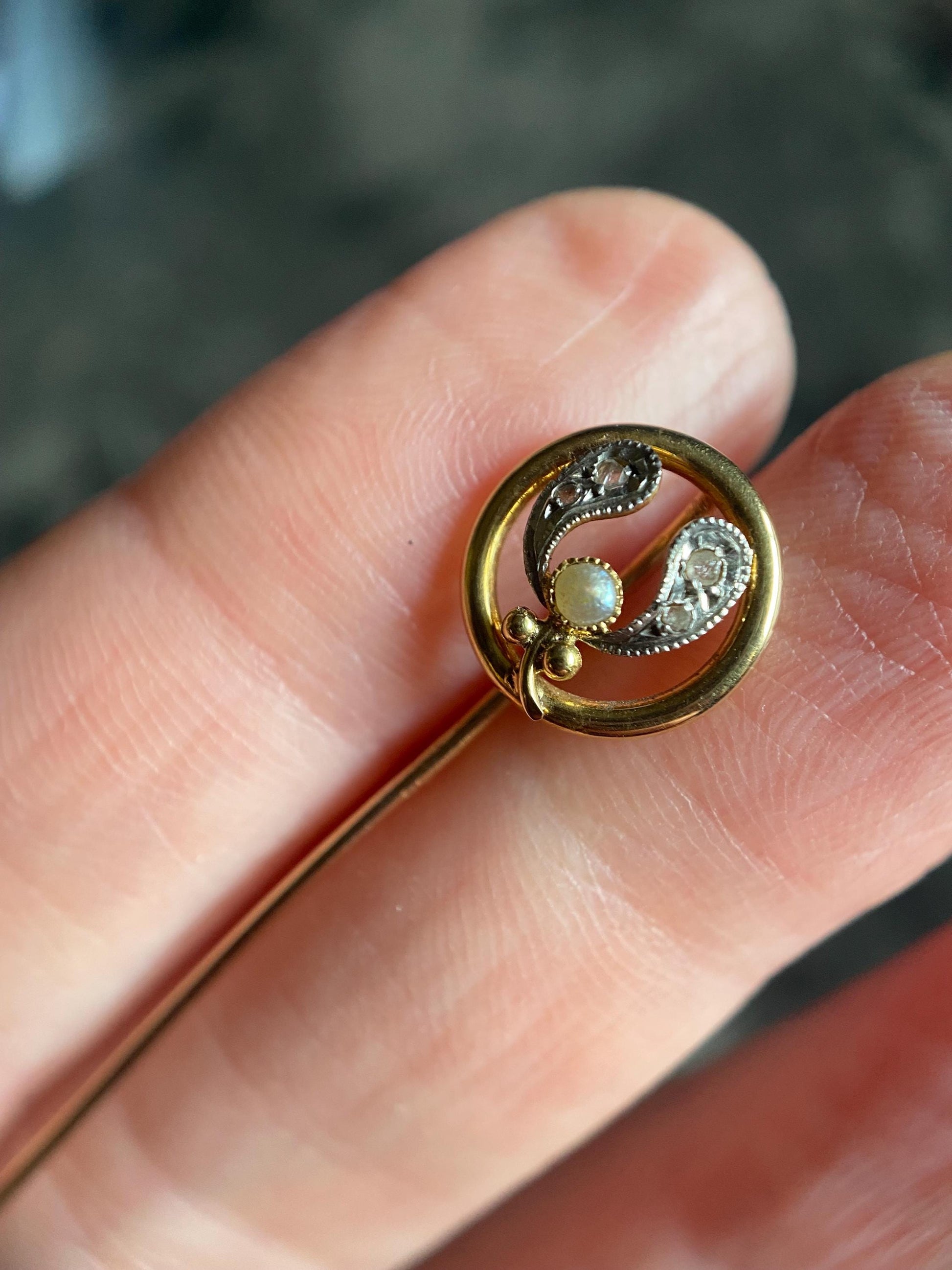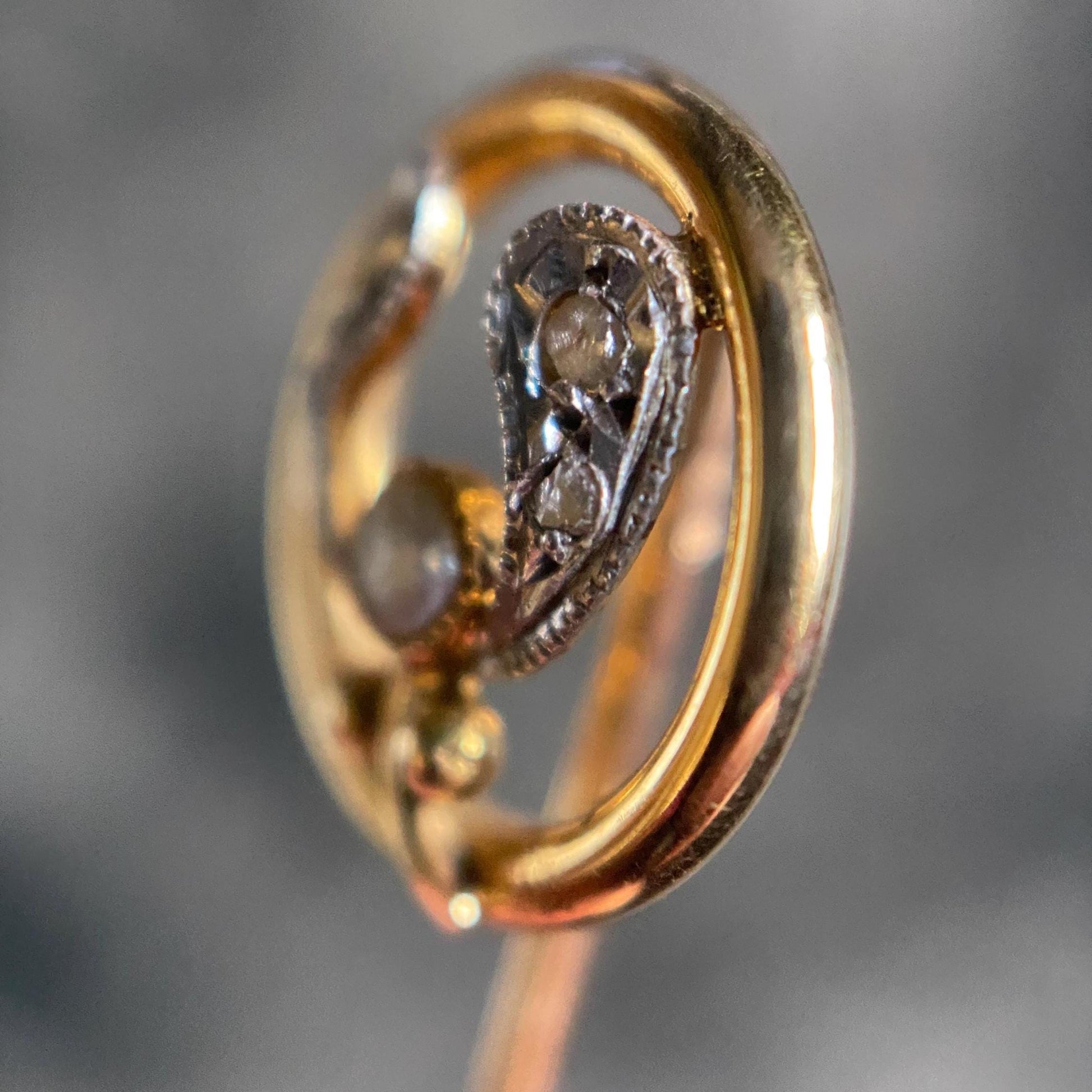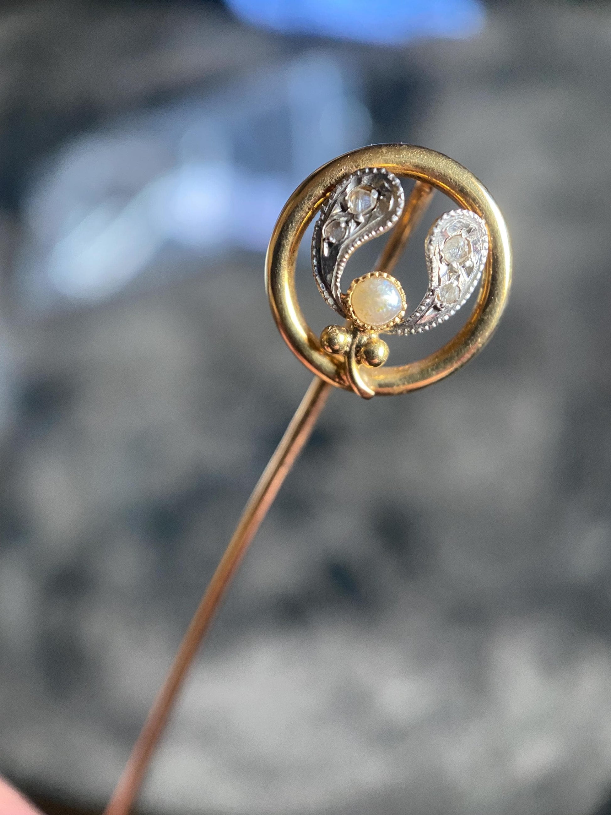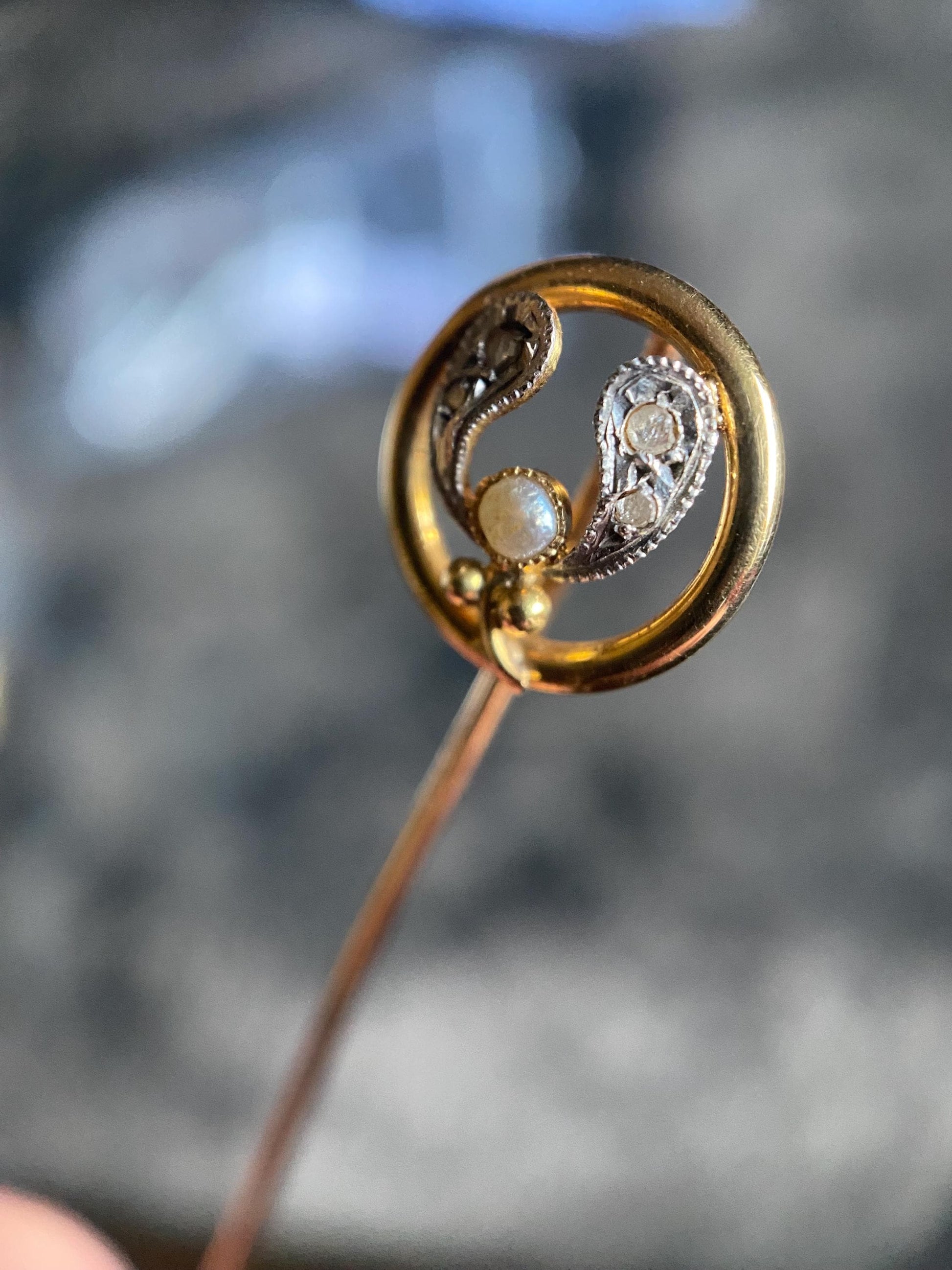 A cleanly designed, flowing French Edwardian openwork botanical composition representing a sprig of mistletoe tops this mixed metals stick pin: with silver leaves studded in diamonds and a singular white berry from a half pearl; both in fine milgrain frames.