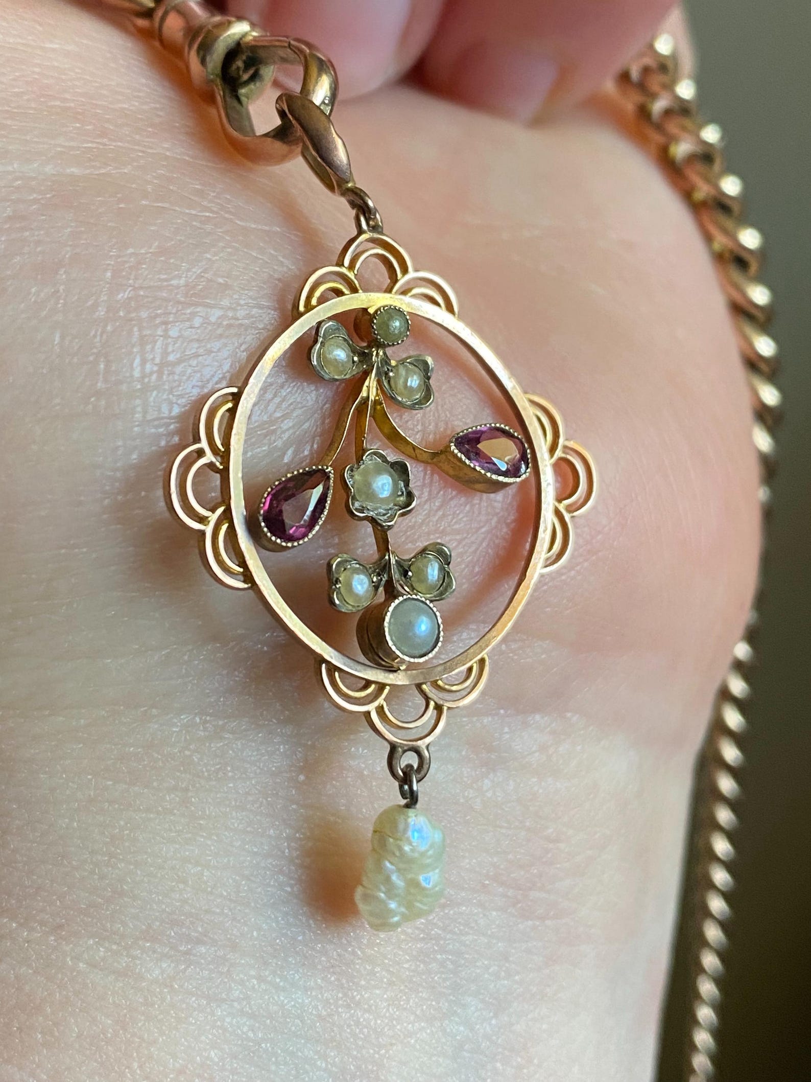 Antique Edwardian Round Openwork Floral Pattern Lavalier Pendant with Berry Pink Garnets, Seed Pearls & Baroque Pearl Dangle in 9k Gold circa 1910, Drop, Necklace, 1900's, Art Nouveau