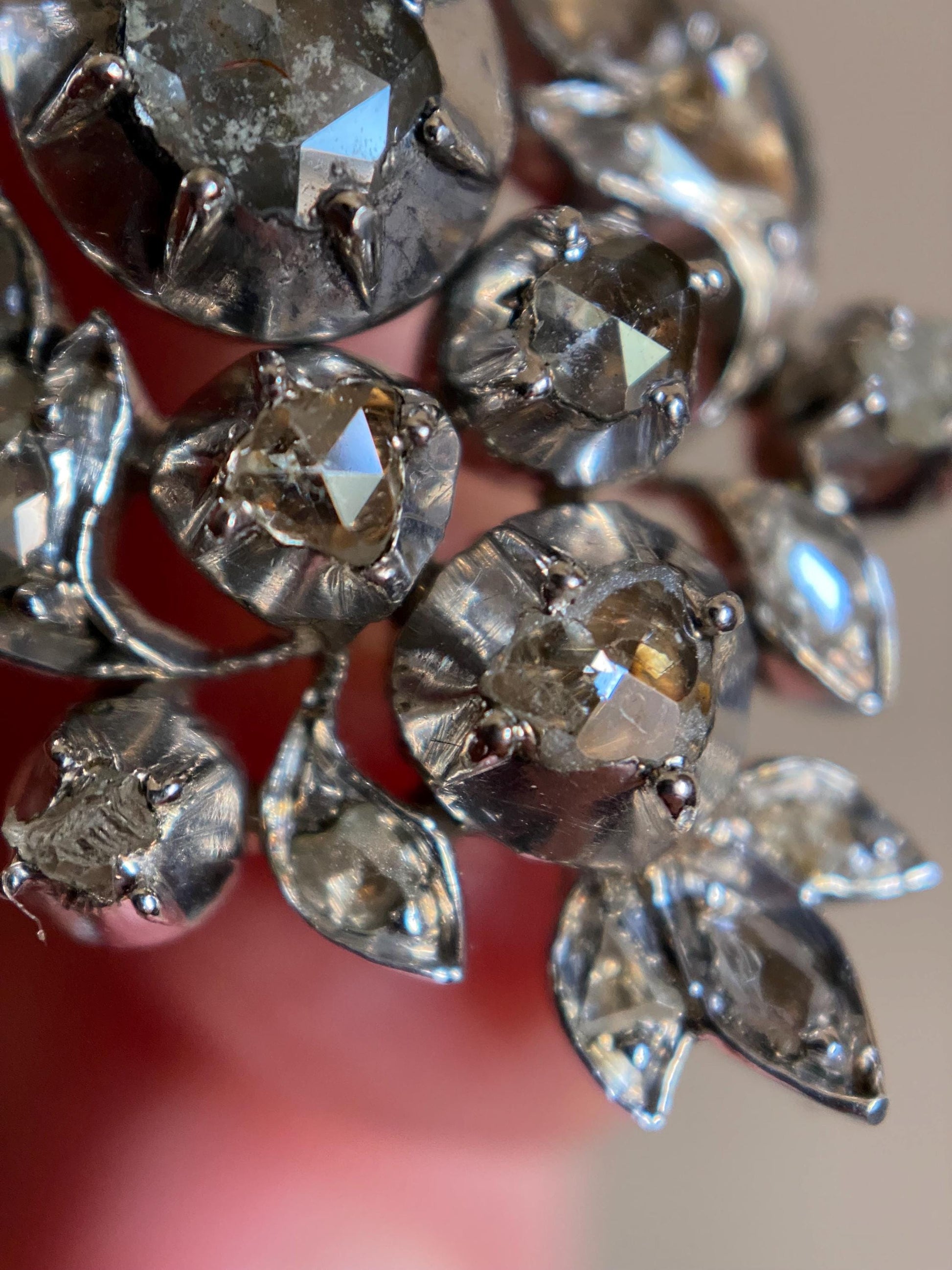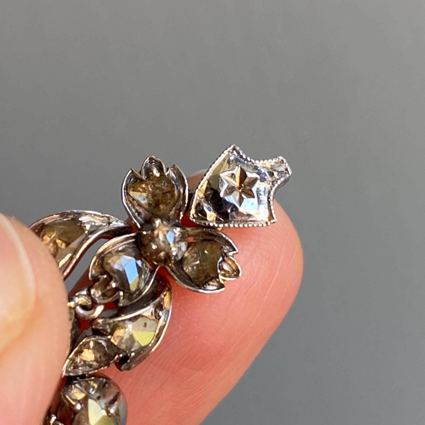 While its form is comprised of a proliferation of a multitude of differently shaped and variously connected components, ranging from spindly foliate flourishes, pointy laurels, to unadorned circles and teardrops,--every nook and cranny of its surface is studded with exceedingly characterful and scintillating old rose cuts.