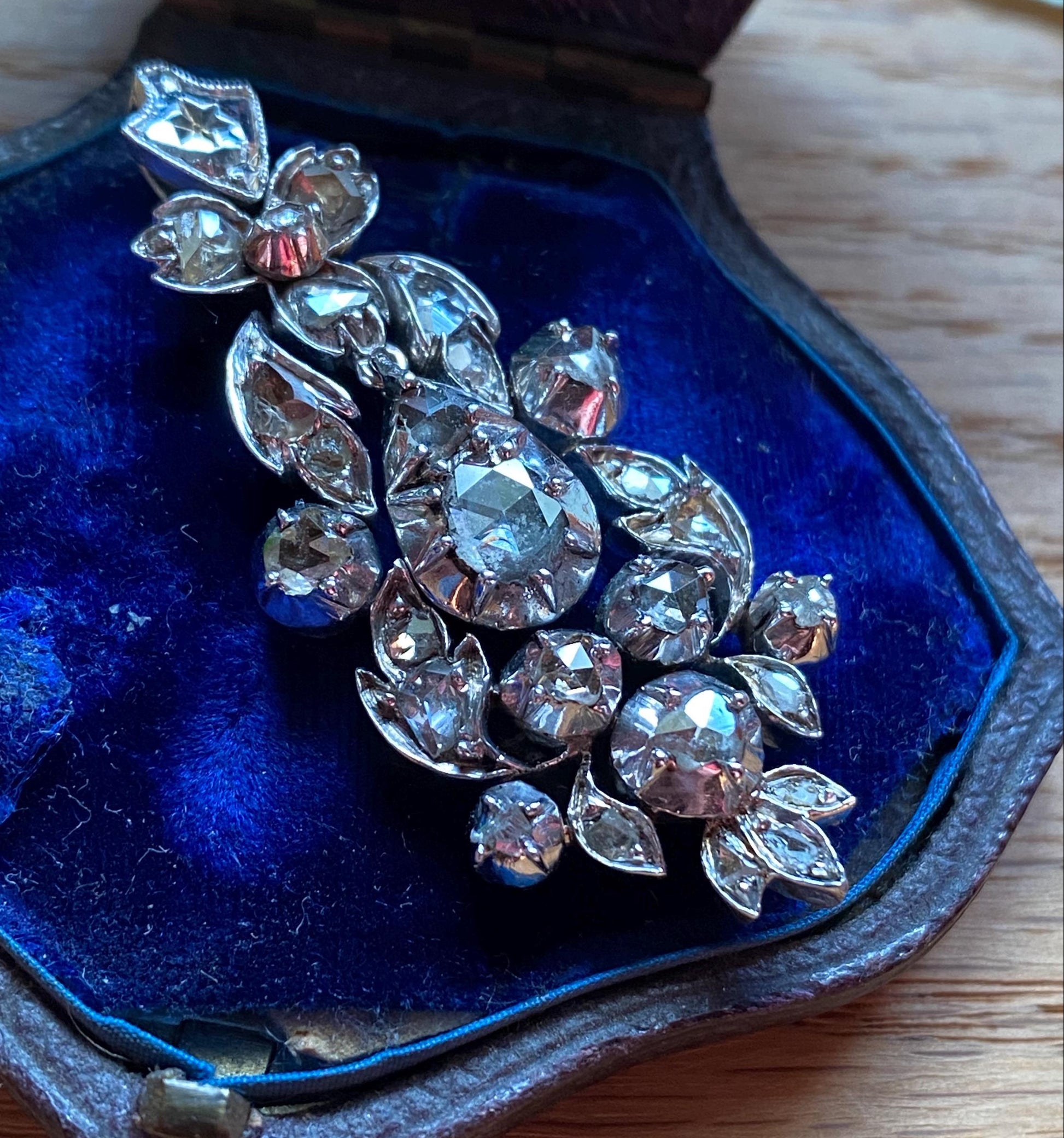 As a total treat, the large central pear shaped drop, stuffed with not one, but two, chunky rose cuts, is articulated! With its subtle jiggle and sway compounding and contributing to the moody and atmospheric glittery aura of the pendant.