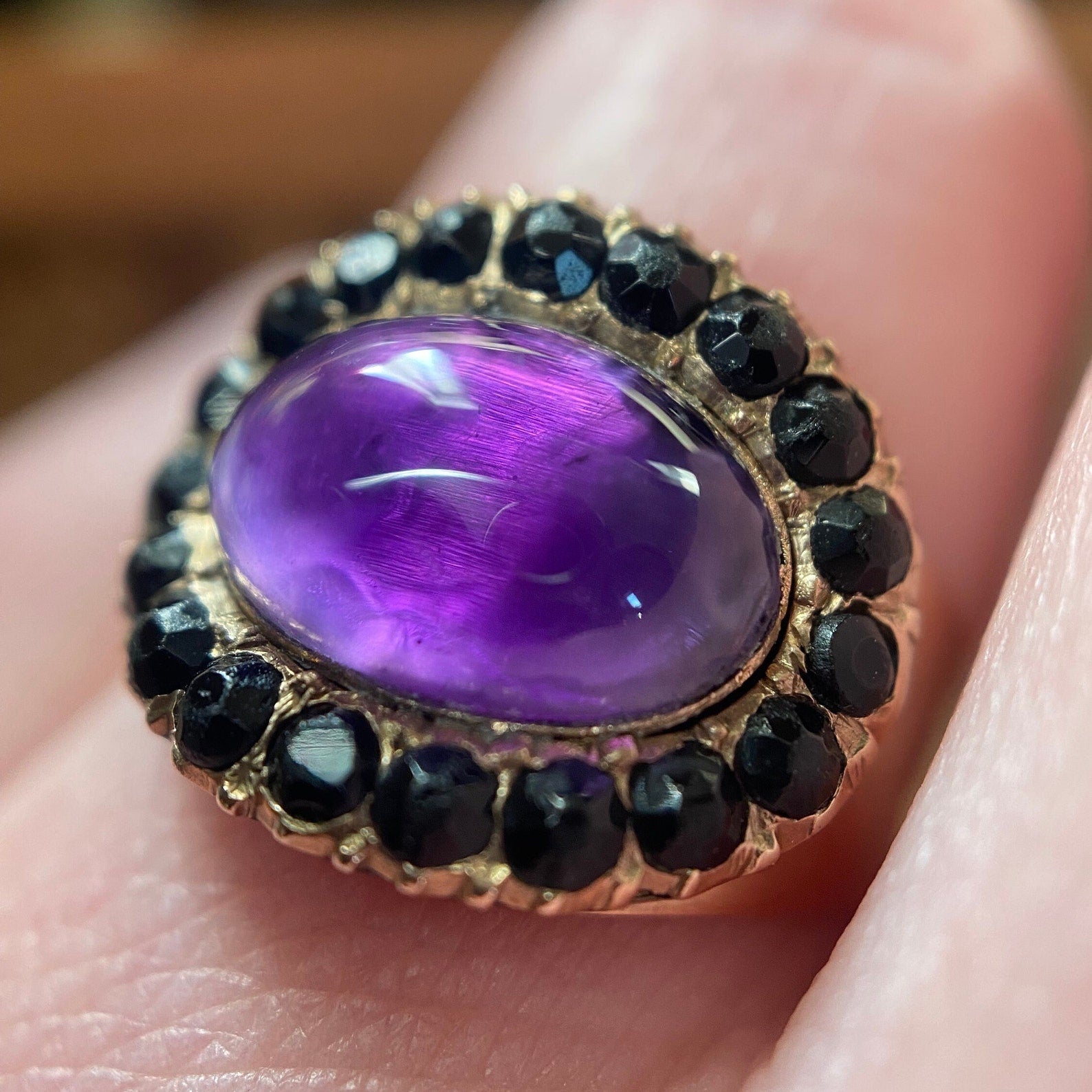 The central amethyst has an incredibly, almost watery, luscious depth thanks to its high reflective foiling. It flashes purple, pink and silver with changes in movement and light, and halo of sparkling jet beads encircles its oval form.
