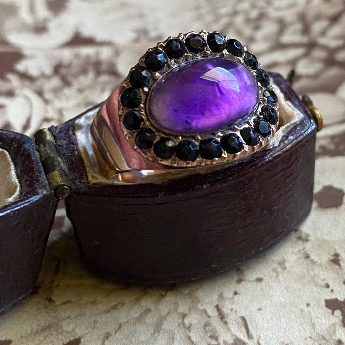 Antique Georgian Mourning Ring for a Young Boy with Foiled Amethyst and Jet Surround in 9k Rose Gold, Memorial, Sentimental, 1800's