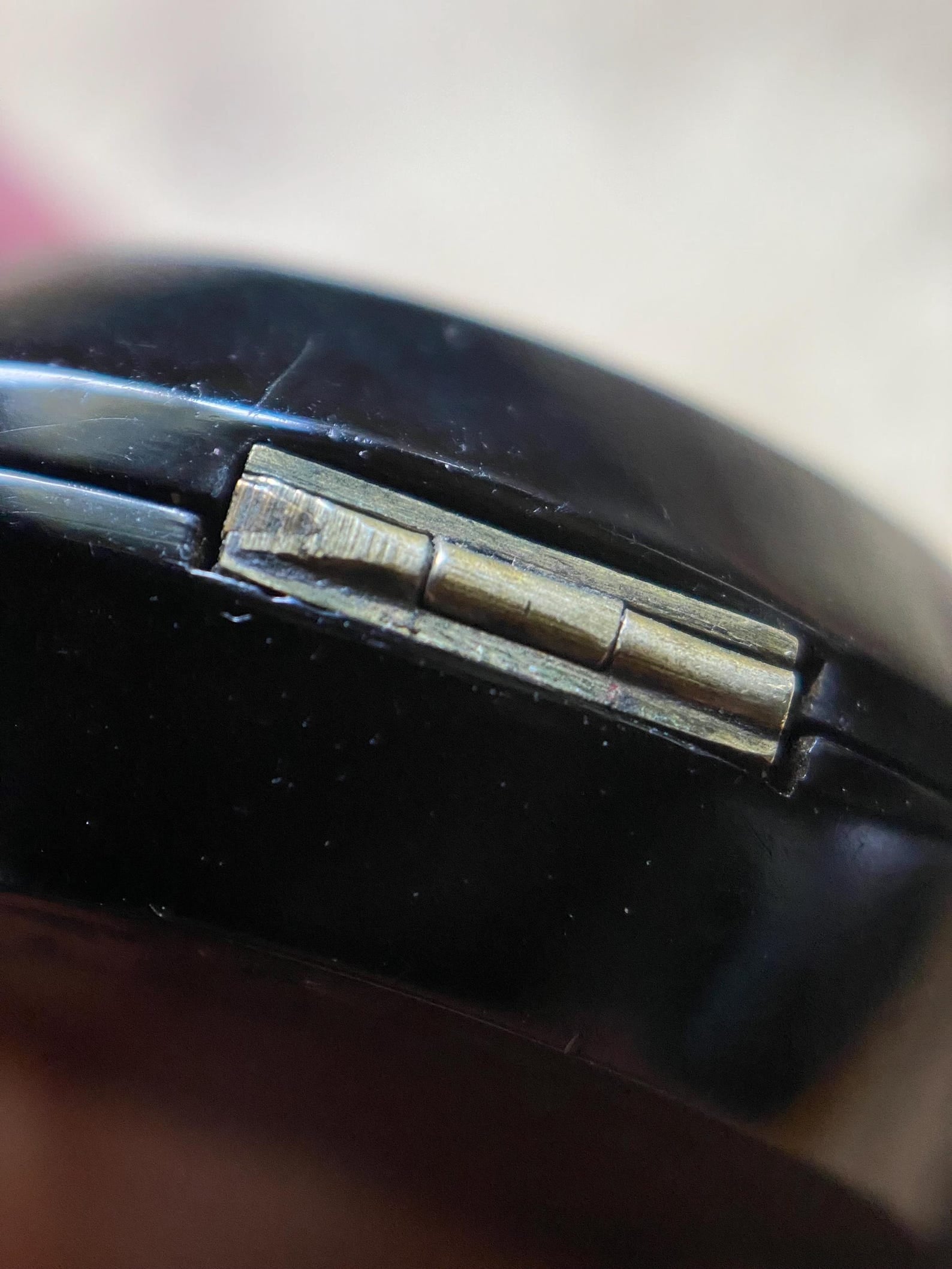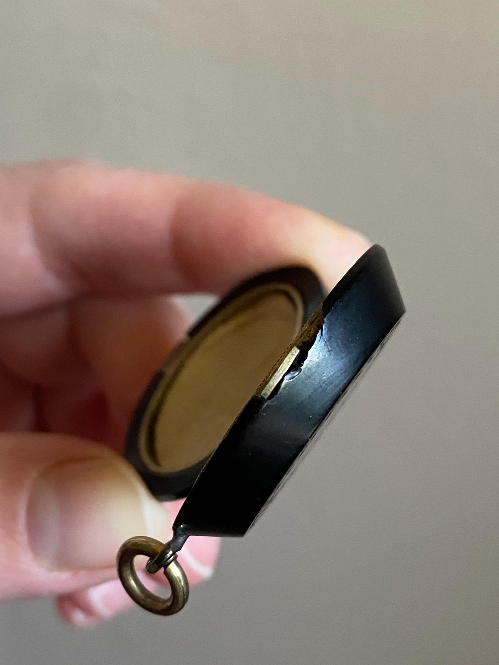 In good antique condition. It is in perfect working order, and there is a chip near the opening clasp. It measures 1.25 inches by 1 inch, excluding the bale, and weighs 12.4 grams.