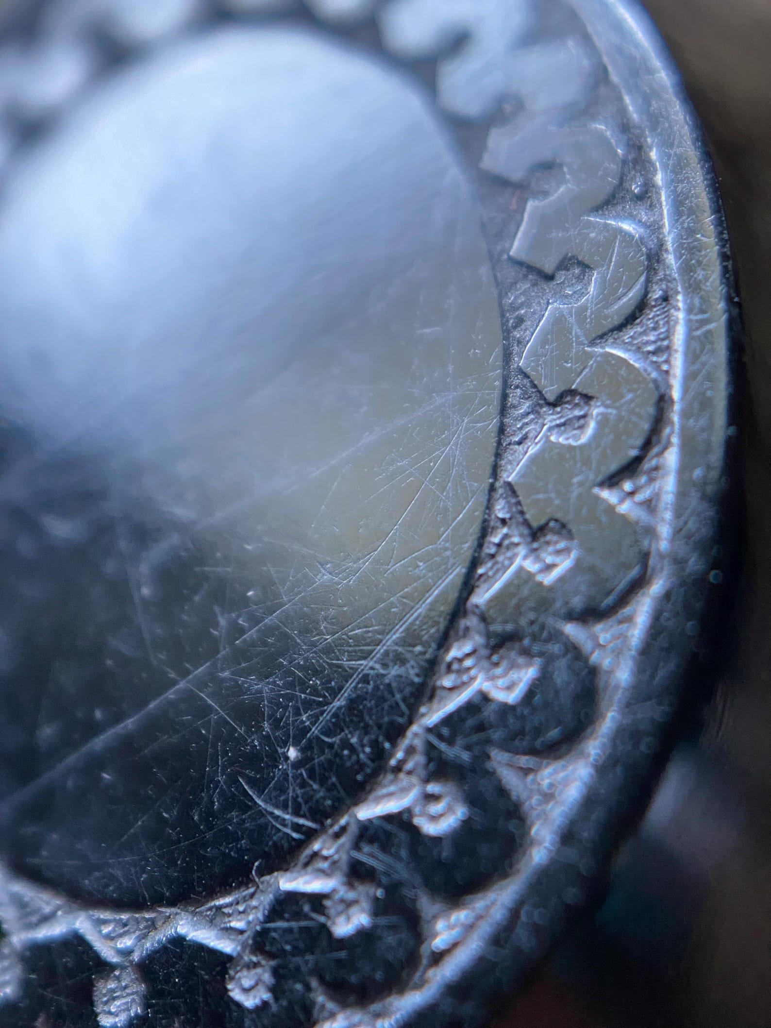 The other side has been mostly left plain, besides a thick scalloped framing bordering the edges and encircling an oval center.
