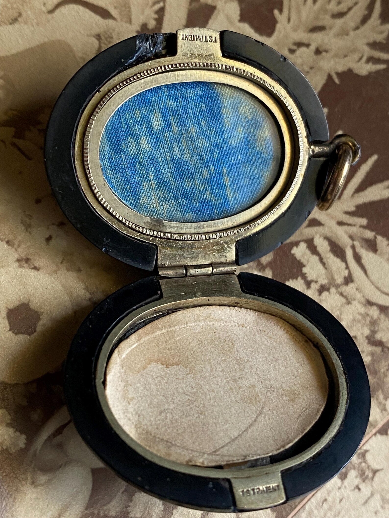 Ready to house new miniature mementos in its metal frame with the original cardboard, fabric and one glass insert still intact; one side shows a finely rendered shield inside a diamond-shape, atop a duo of multi-textured backgrounds.