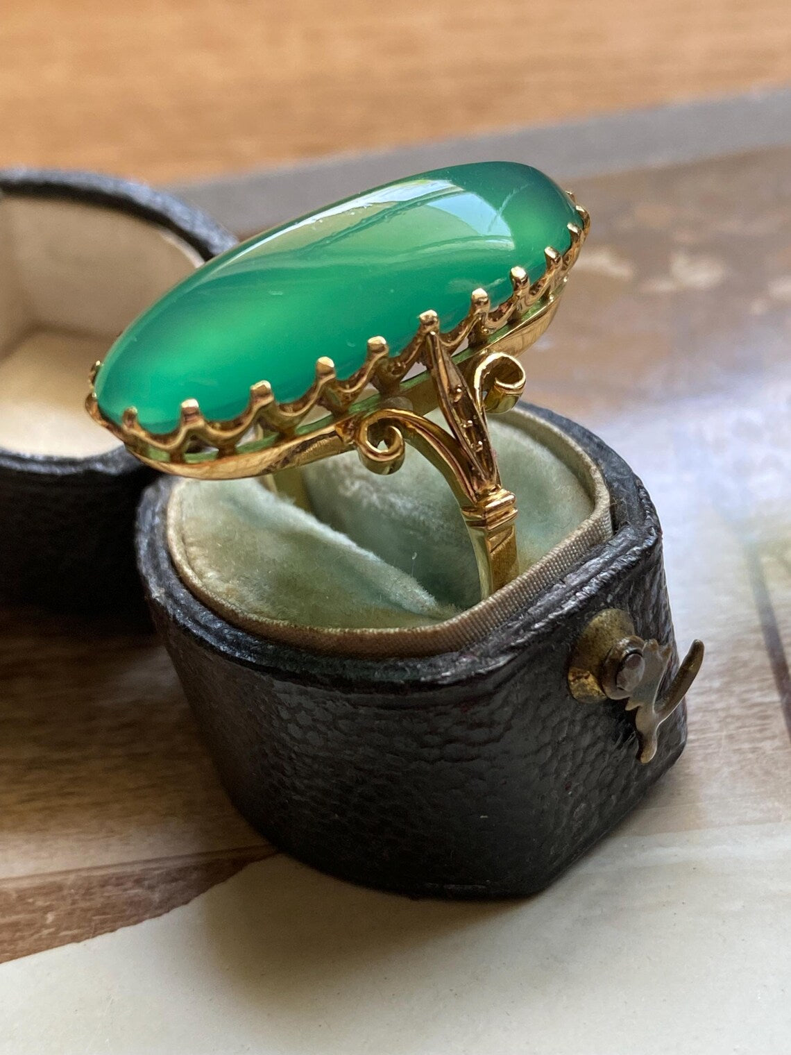 With ample finger coverage thanks to the large central stone, a chrysoprase set in fabulously sharp and tidy claws, the cabochon flashes moodily from aquamarine to candy apple green.