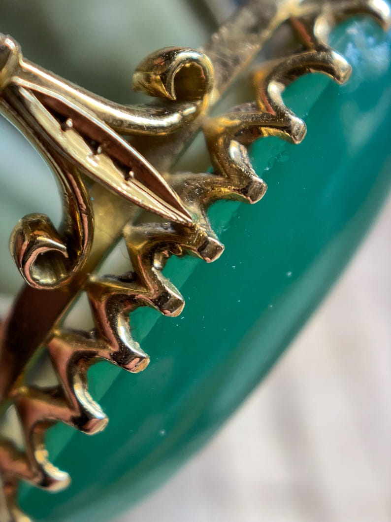 This eye catching and arresting Victorian era marquise shaped ring will not go unnoticed; glowing a mystic green from within.