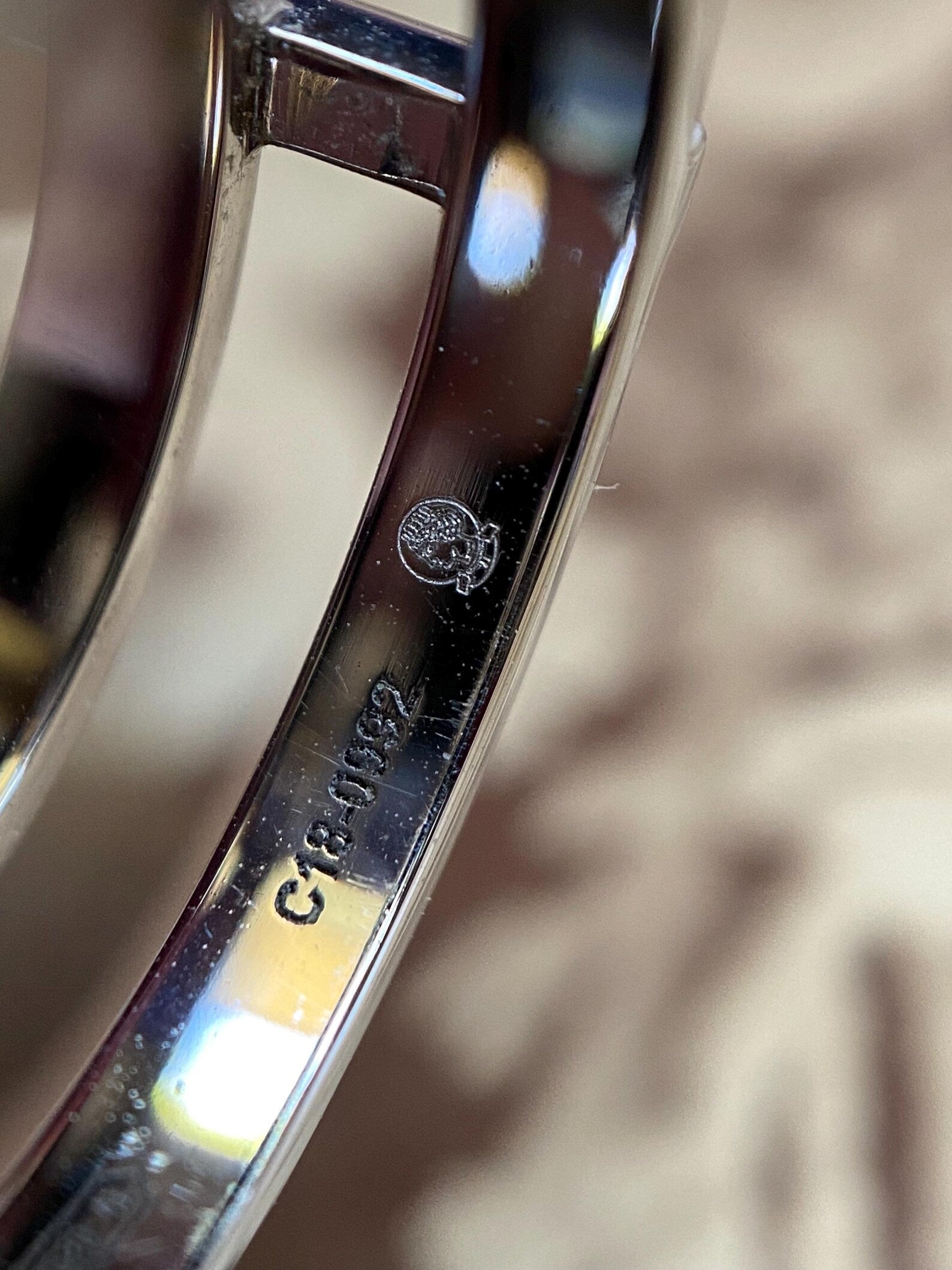 It is comprised of three fixed bands of thick, solid 18k white gold with a vertical connector to the back to keep everything in place, with the entire length of the knuckle decorated.