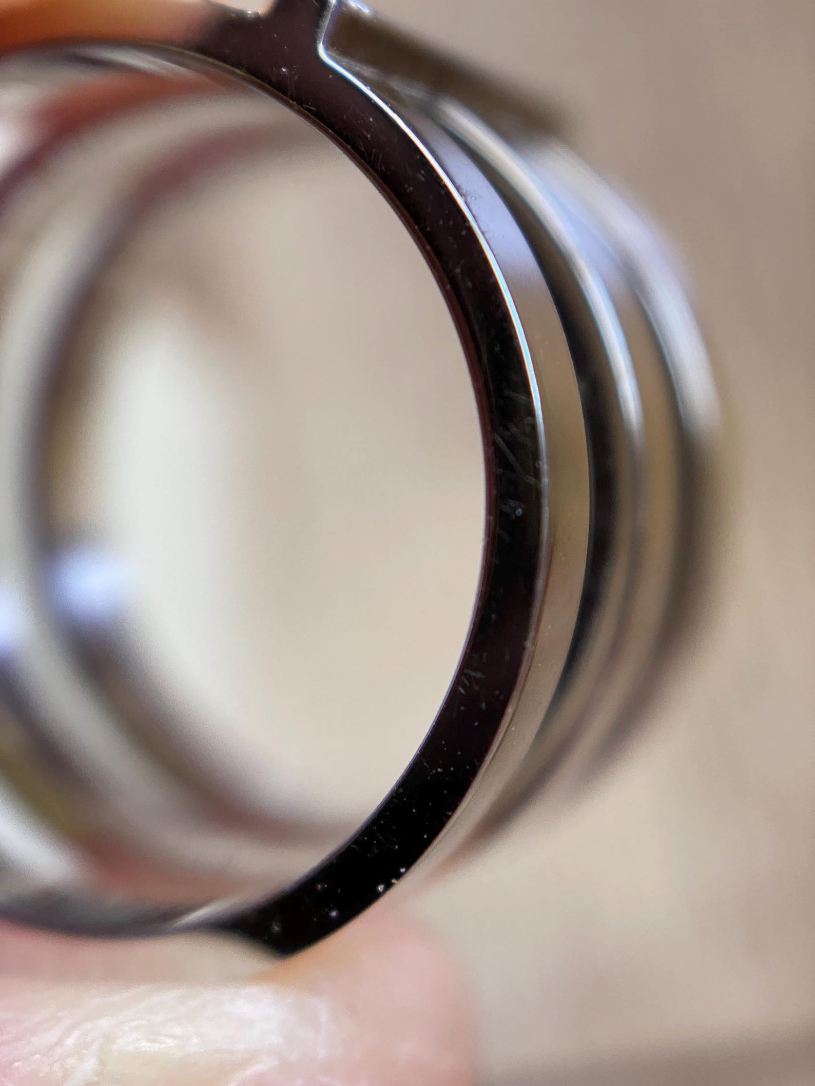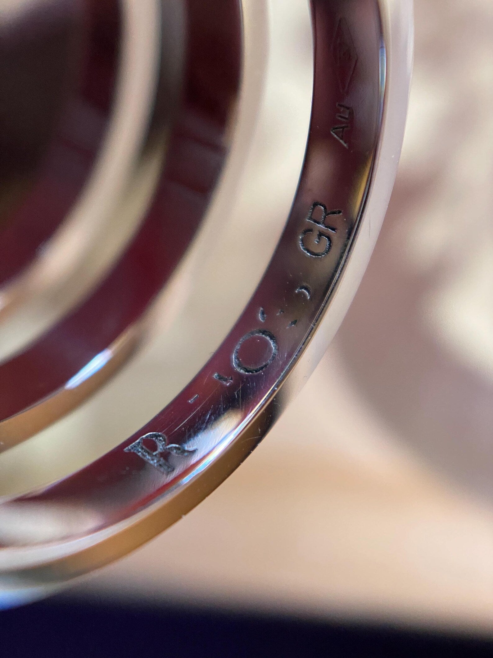 In excellent condition. It weighs 7.4 grams, and its size spans between a 5 to a 6, due to its construction.