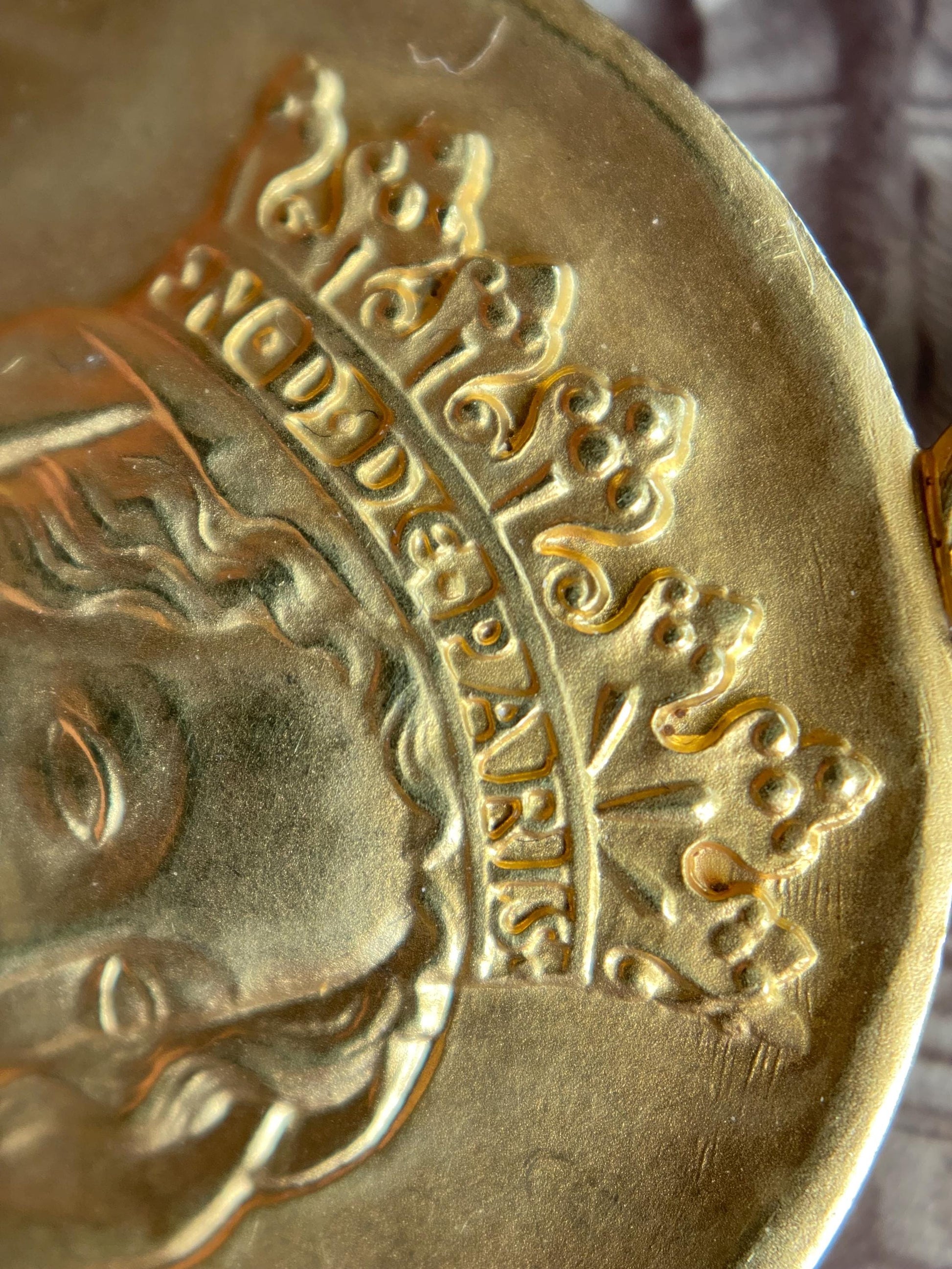 A serene & regal interpretation of The One True Primordial Mother, titled “Notre Dame de Paris”, (or “Our Lady of Paris,”) looks benevolently outwards from a fine face; almond eyes, a well formed & projected nose, and a crown upon her forehead in this large solid vintage medal pendant.