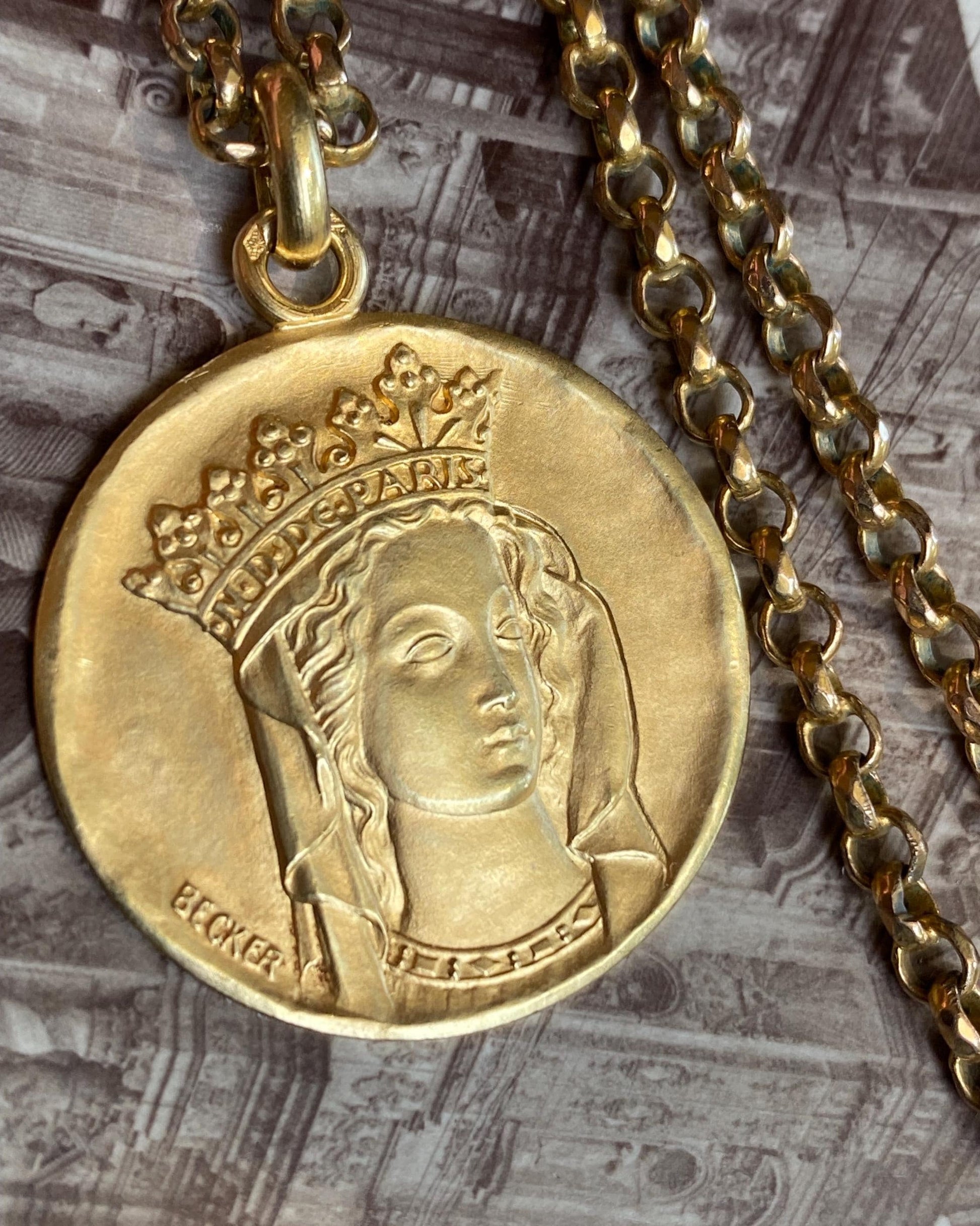 Vintage French Signed Becker "Notre Dame de Paris" Virgin Mother Mary Religious Medal Pendant w/ Inscription c. 1967 in 18k Gold, Medallion