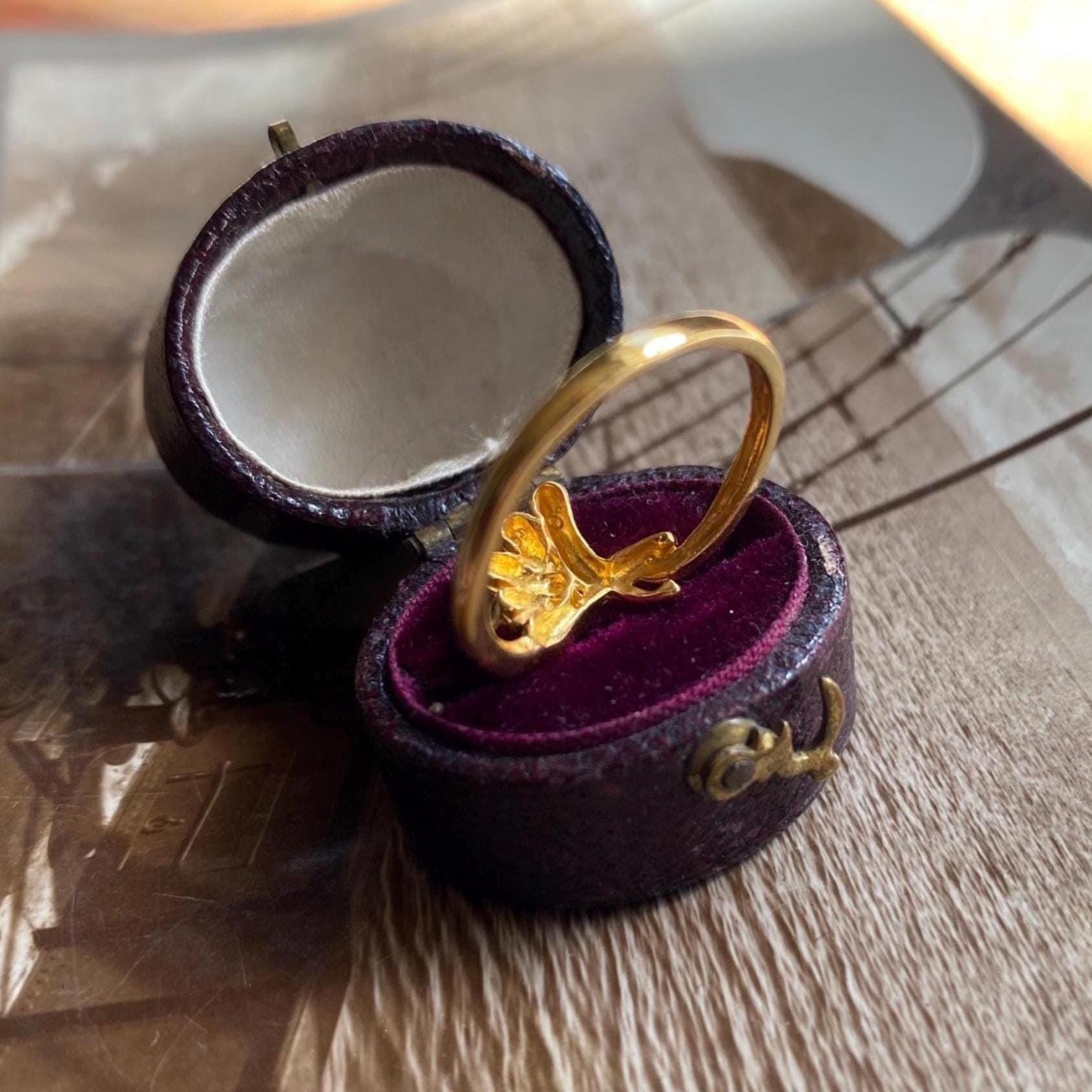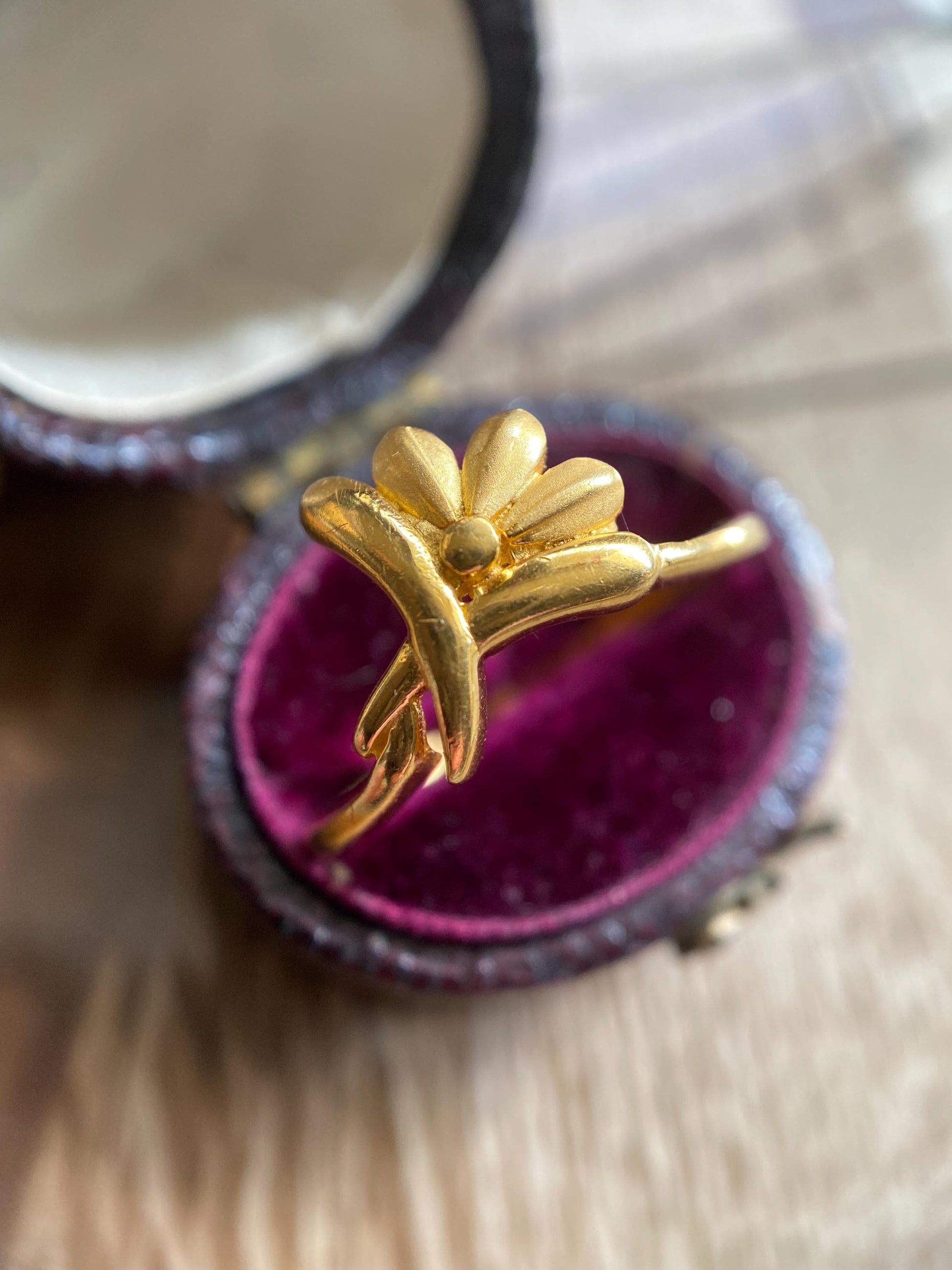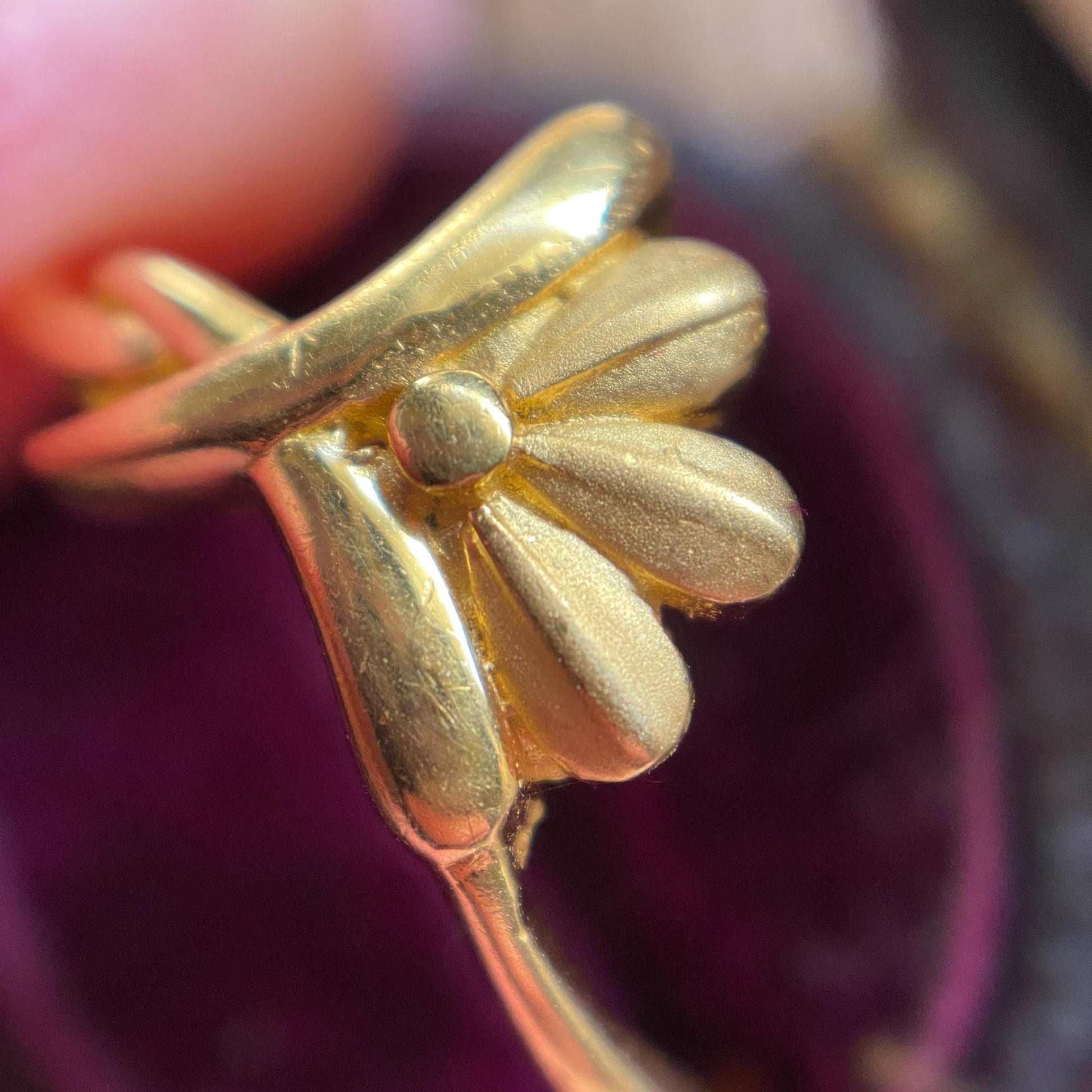 A vintage, retro super high karat ring with an abstract and asymmetrical floral swipe bezel: Opening up for a trio of matte petals that juxtapose beautifully with the high shine finish of the rest of the piece, it resembles a flower in bloom.